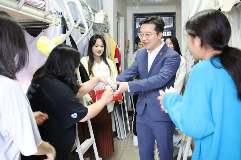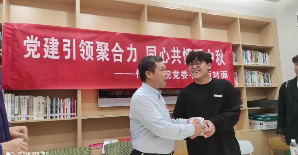 学院党委书记兼行政副院长江俊瑞、党委副书记兼服务站站长高嘉炜深入学生公寓,与学生开展座谈,并向学生发放月饼。