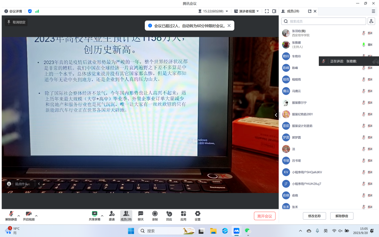为帮助服装与服饰设计2023届毕业班学生树立职业生涯规划意识,明确未来奋斗目标,提升大四学年学习动力,服装与服饰设计专业邀请张雅娜副教授于2023年9月20日对学生开展职业生涯规划线上讲座。