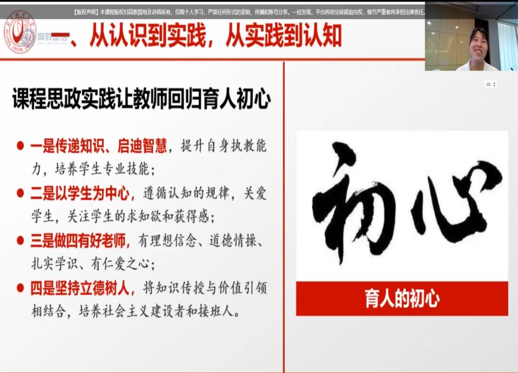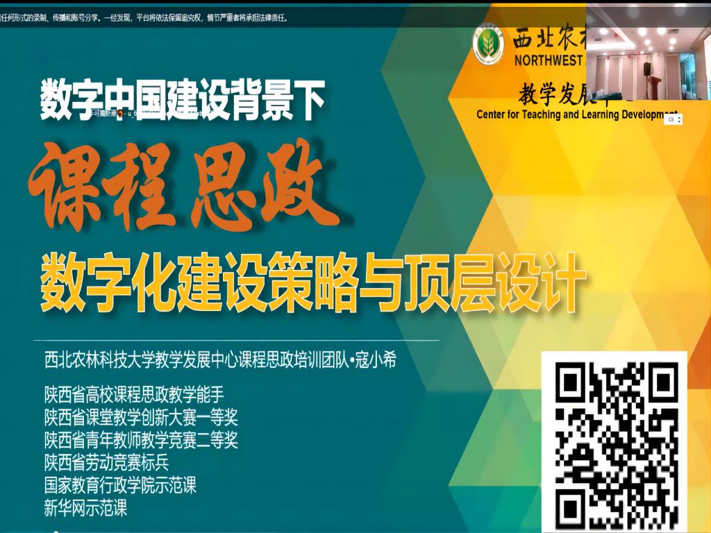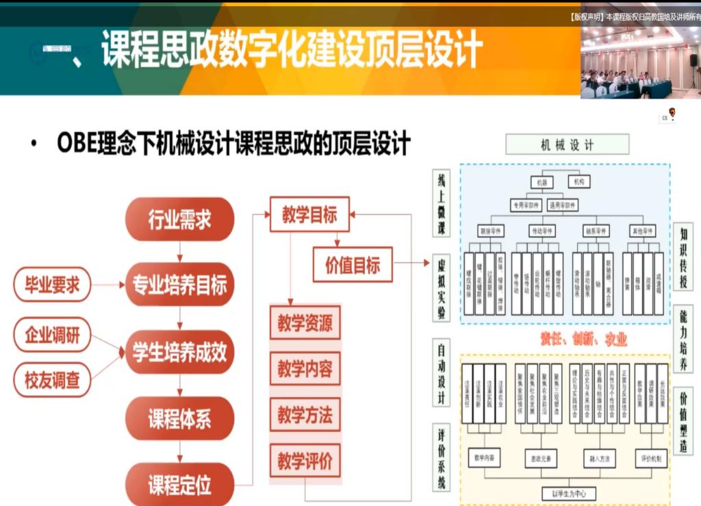西北农林科技大学寇小希老师主要讲述关于OBE理念下课程思政的顶层设计,通过自己课堂上的具体案例,为高校教师们讲解如何以学生为中心设计课程目标,以便于学生快速吸收课堂知识、能力、价值等内容。