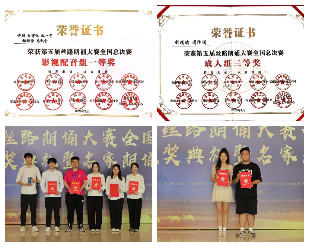 第五届丝路朗诵大赛全国总决赛于2023年7月14-16日在曲江国际会议中心举行,我校播音与主持艺术专业学生许朔、赵霈仪、孙一宁、张梓莹、高凯含荣获影视配音组一等奖,播音与主持艺术专业学生刘婧瑜、闫泽涛荣获国赛成人朗诵组三等奖,恭喜以上获奖同学。