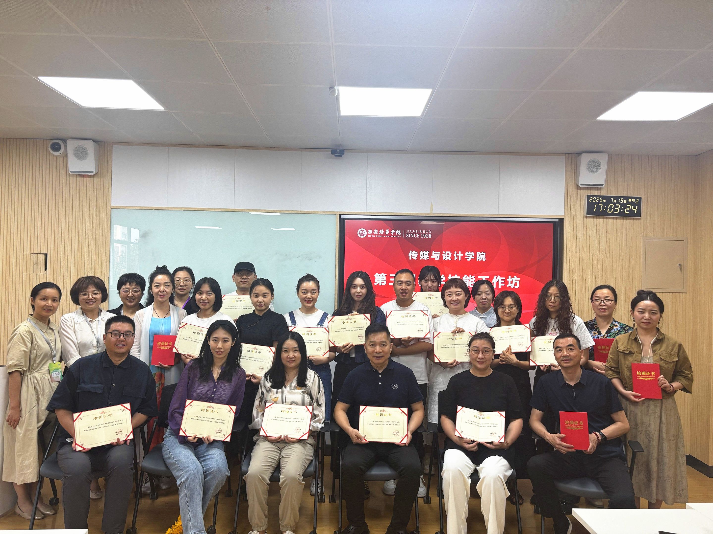 两期工作坊在热烈的掌声中落下帷幕,引导员老师们为参训教师颁发证书并合影留念。本次工作坊是学院教师教学能力提升计划的重要一环,不仅提升了教师的教学能力,更促进了跨学科教学经验的交流,为学院打造高水平、创新型教学团队奠定了坚实基础。下一步,学院将持续开展教学技能提升相关培训,为打造高水平“传媒+设计”金课蓄力赋能。