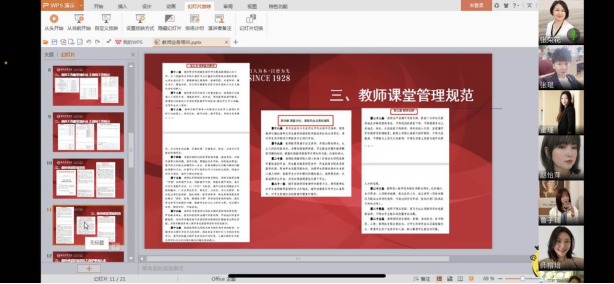 张副院长最后讲解了学校和学院对疫情特殊期间线上教学的具体规范和要求,并提出了一些实操层面的建议。她表示做好基础教学工作,扎实上好每一门课程是教师的基本功,新进教师更应该苦练内功,她要求各专业要对新进教师实行一对一帮扶指导,以便更快适应岗位要求。