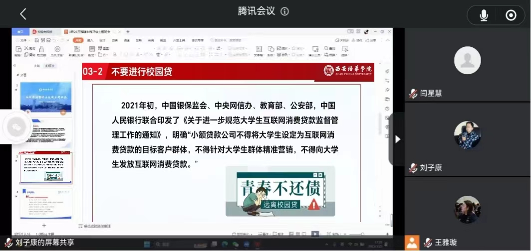 辅导员们充分认识到平安校园建设的重要性,围绕着“平安校园评估认定复审工作是什么?为什么要平安校园评估认定复审工作?怎样协调推动平安校园评估认定复审工作进行?”开展了宣传学习,重点加强了预防电信网络诈骗、宿舍用电安全、道路交通等方面的宣传教育,加强校园不良网络贷款的预防和教育,并集中回答了学生们对安全问题存在的疑问。