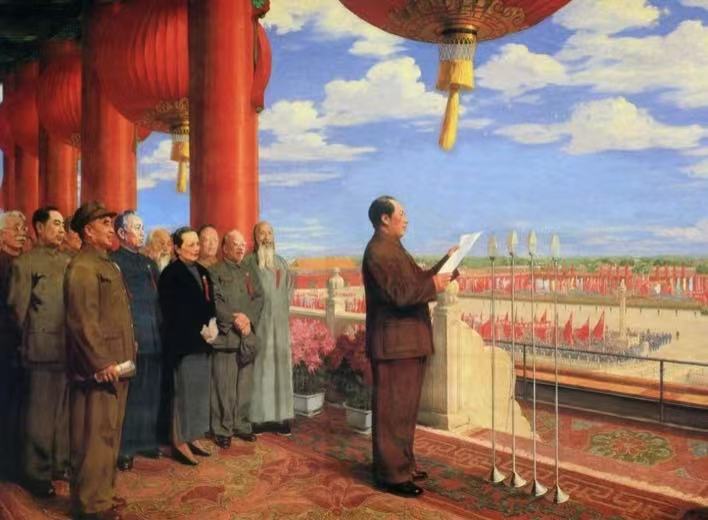 1949年10月1日下午,首都北京30万军民在天安门广场隆重举行开国大典。毛泽东庄严宣告:“中华人民共和国中央人民政府今天成立了。”54门礼炮齐鸣28响,象征党领导人民奋斗28年的历程。中华人民共和国的成立,揭开了中国历史新的篇章。领导和组织人民革命取得胜利的中国共产党,成为在全国范围执掌政权的党,踏上了带领人民创造幸福美好生活的新征程。党的历史也揭开了新的篇章。