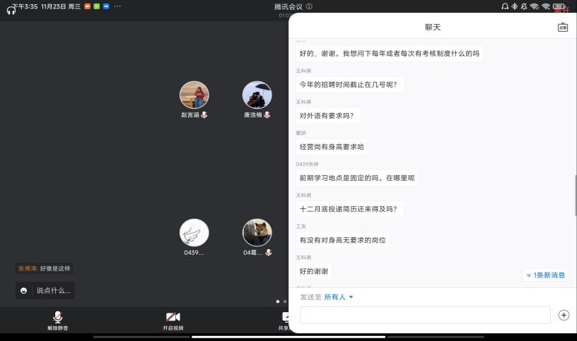 负责人曹禄洋向同学们展开说明主要招聘的岗位以及岗位的基本要求与内容,让学生自由选择。同学们针对自己感兴趣的岗位提出疑问并与公司进行线上交流沟通,主动了解用人单位的基本情况并表达自己的求职意向,公司对毕业生的就业疑惑进行了详细的解答,并留下联系方式让有意向学生进行进一步的咨询。