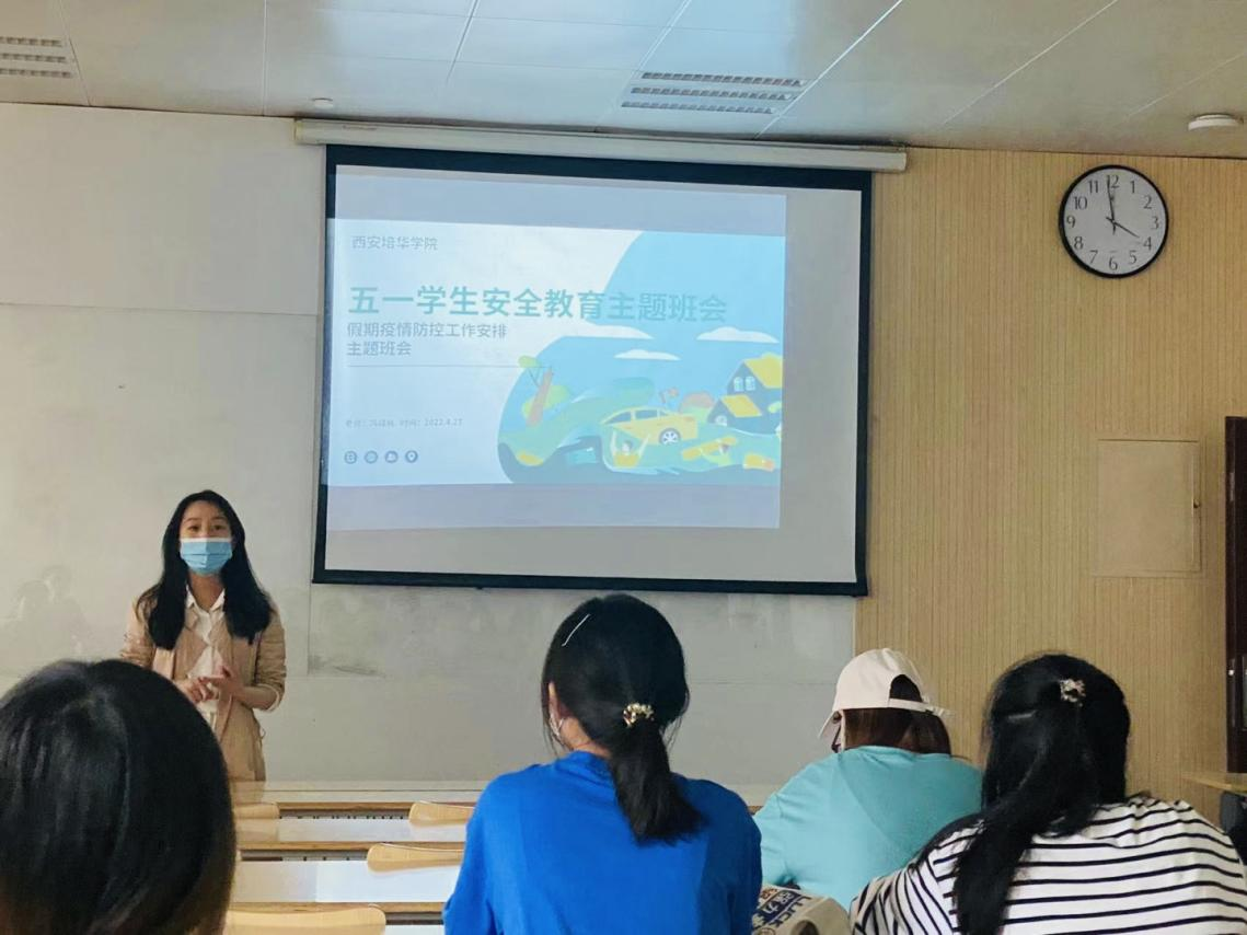 辅导员冯靖敏老师在班会讲到:在“五一”劳动节到来之际,为使同学们度过一个愉快、平安、健康、充实的假期,大家尽量减少外出,不聚集、不扎堆做好疫情防控工作。学生们一定加强疫情防控意识,深刻认识到当前疫情防控形势的严峻性和复杂性,积极配合学校疫情防控要求,学生离校期间必须全程佩戴好口罩,保持安全距离,不聚集,尽量避免前往人员密集区域。其次就防溺水、交通安全、食品安全和防火、防盗、防安全事故、防电信诈骗,等方面内容对学生进行安全教育,提高学生安全意识和安全防范能力。最后,要求班级内积极开展学生离校、留校的登记工作,严格落实学生请假和按时返校制度,以便及时掌握学生的假期动态,做好疫情防控工作。