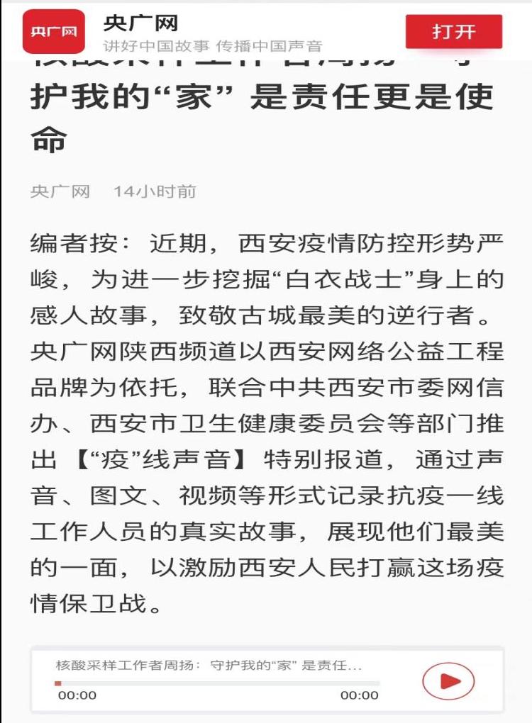 此次专题片的录制是央广网陕西频道以西安网络公益工程品牌为依托,联合中共西安市委网信办、西安市卫生健康委员会等部门推出的《“疫”线声音》特别报道,通过声音、图文、视频等形式记录抗疫一线工作人员的真实故事,展现他们最美的一面,以激励西安人民打赢这场疫情保卫战。