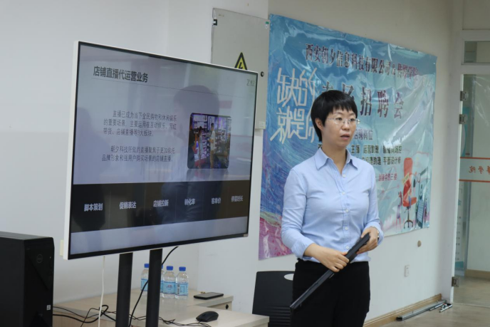 招聘会上,企业招聘人员通过播放宣传片、PPT展示、现场讲解等方式向同学们介绍了公司概况、企业文化、薪资待遇等。其次企业招聘人员对本次招聘岗位及岗位要求进行简要介绍,本次招聘岗位设有百度直签主播、主播、运营助理、直播间场控、内容策划、拍摄剪辑等岗位。最后根据岗位需求,公司对参与招聘会的学生进行了分组面试,特别是在对于招聘主播这一岗位,进行了线上与线下的同步会议式面试。
