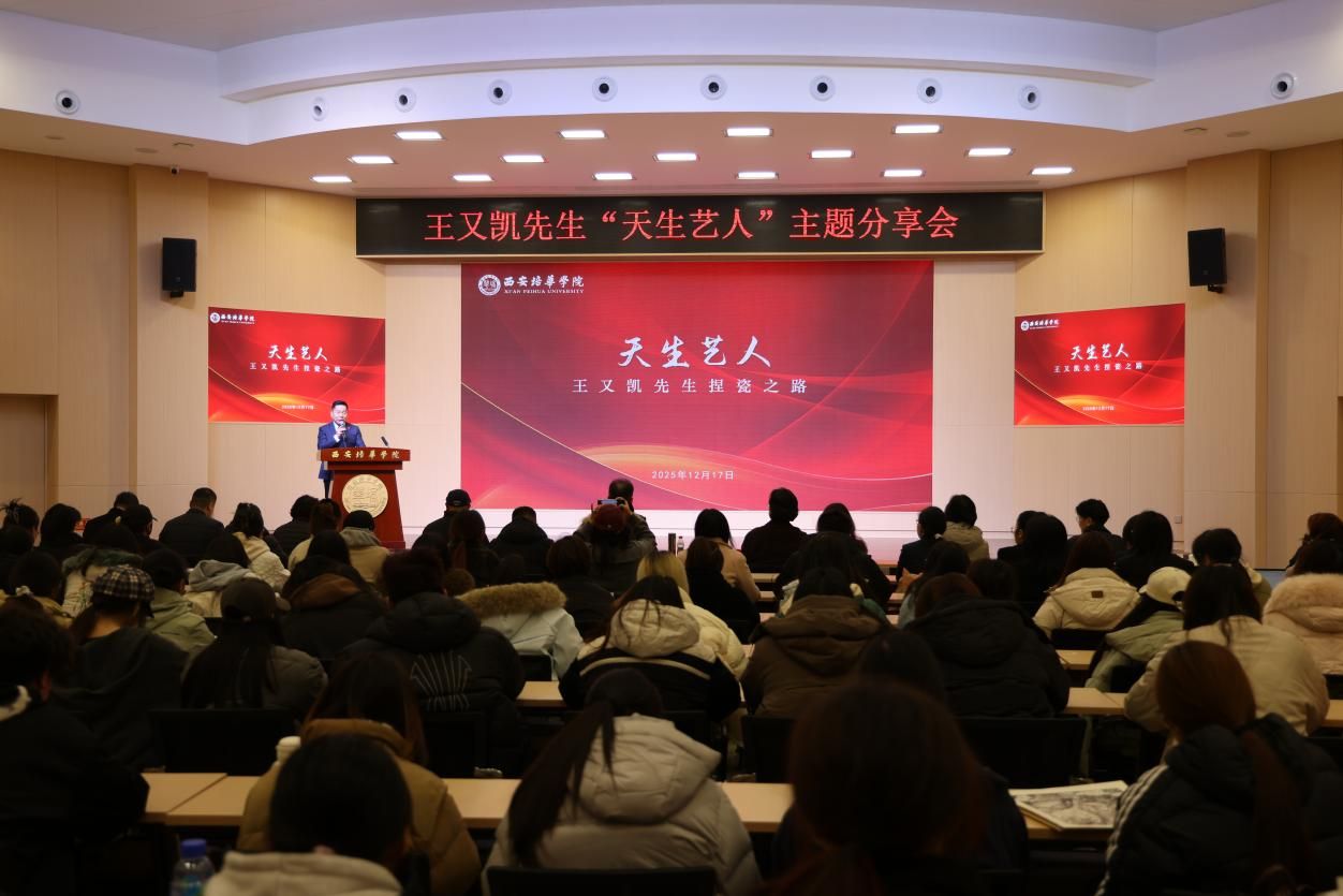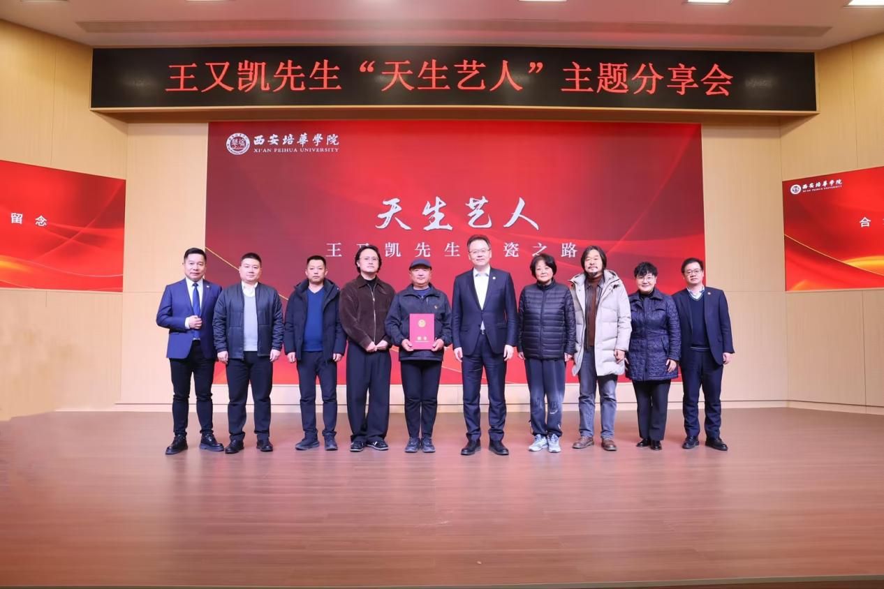 2025年12月17日下午,西安培华学院在明德楼四楼报告厅举行“天生艺人 王又凯捏瓷之路”主题分享会及王文凯特聘教授聘任仪式。理事长姜波致欢迎词,开国上将刘震将军之孙刘迪,培华早期教师、原陕西省委常委副省长刘邦显之孙刘舒辉,传媒与设计学院院长詹秦川、常务副院长徐莹、党委书记王飞及师生代表300余人出席。活动由传媒与设计学院教师贾登银主持。