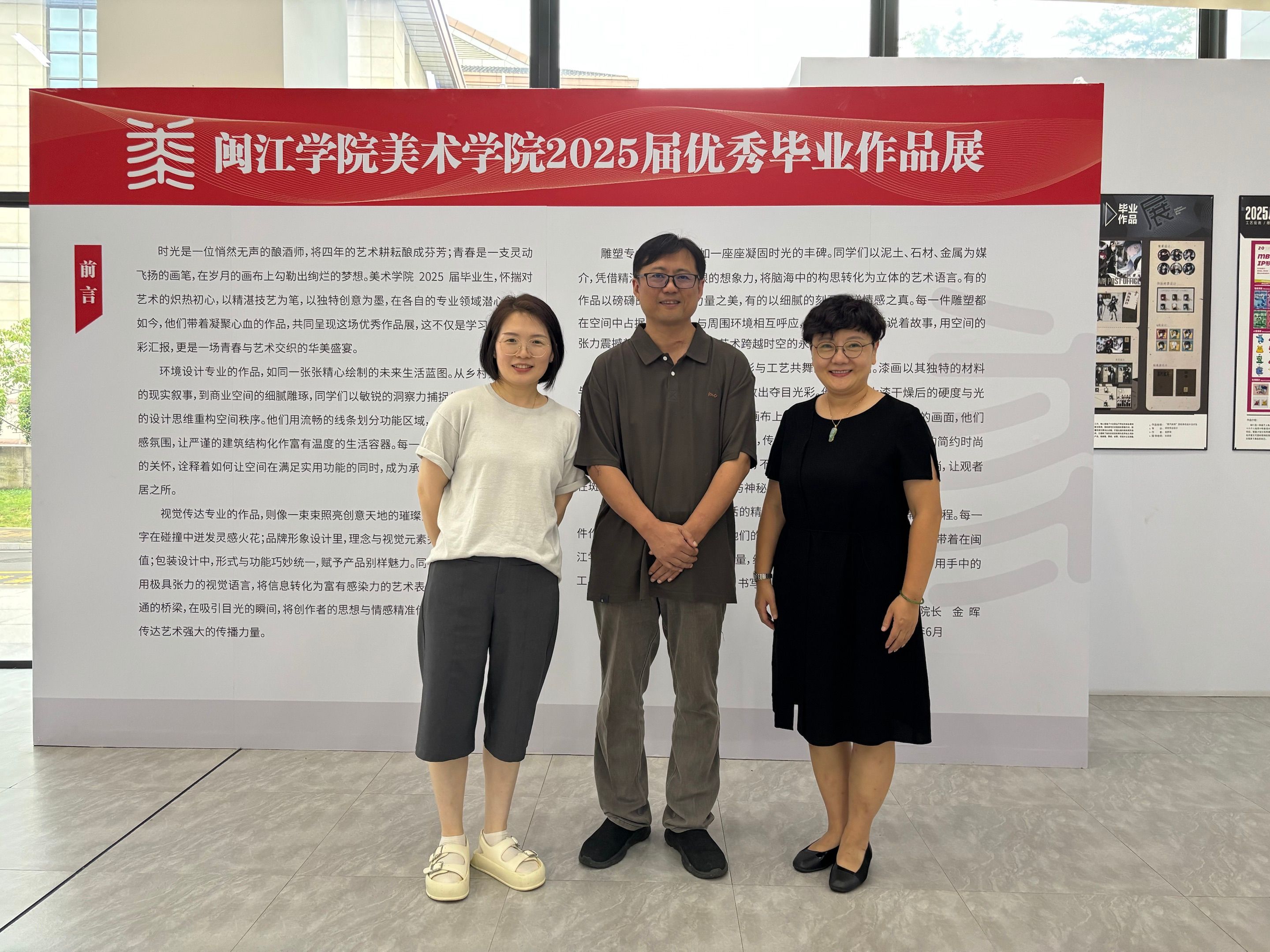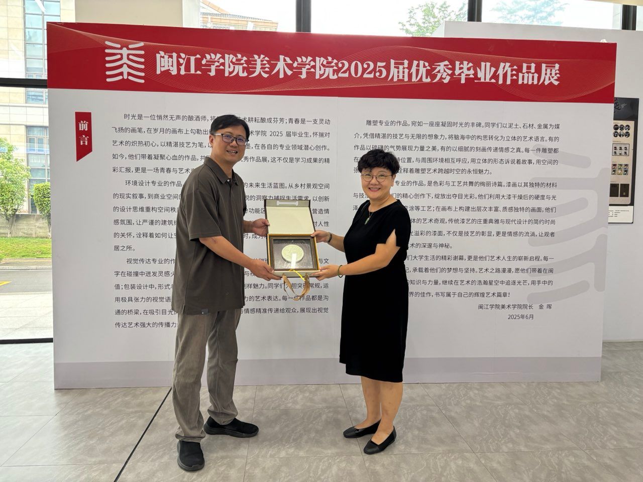 闽江学院美术学院院长金晖教授带领徐院长一行,参观了2025届毕业作品展。此次展览集中呈现了工艺美术、雕塑、视觉传达设计、环境设计等专业毕业生设计作品。金晖教授对毕业生作品中展现的创新思维与专业素养给予高度评价,徐院长一行在参观过程中不时驻足交流,双方围绕作品创作过程、艺术理念展开深入探讨。
