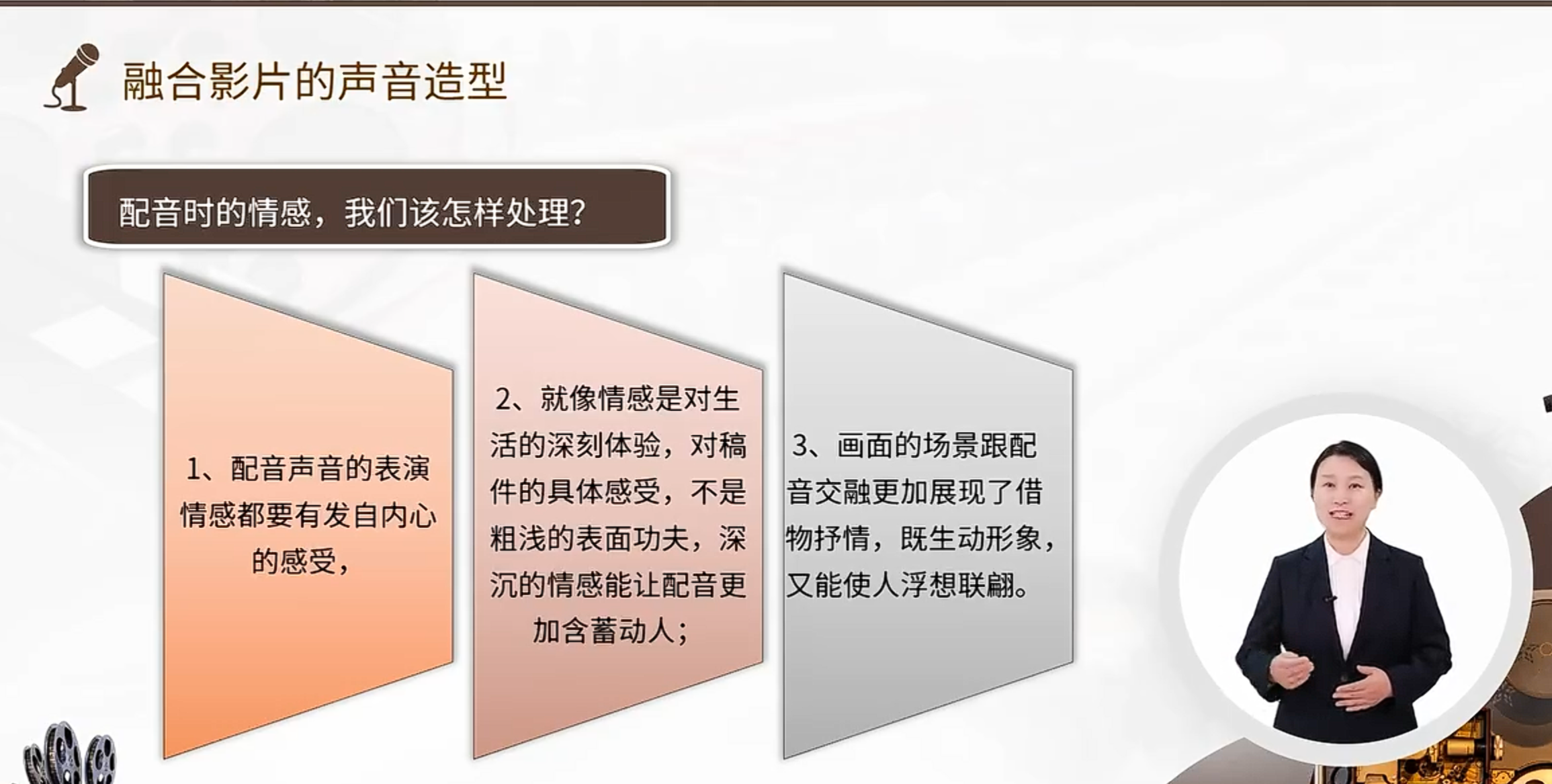 影视剧配音课程教师陈连龙带领学生通过配音影视作品学习红色文化,配音创作通过声音细节,将影视人物性别平等的暗喻巧妙融合,为影视角色命运埋下注脚。课程通过“知识点讲解+案例+课堂问答”三阶递进,引导学生从影视剧人物分析、配音设计、情感调动、语气掌握等方面来提升影视剧配音能力。同时,生动的视频课被用于生成配音角色造型、优化配音语言表达、快速生成配音场景原型,使配音语言表达能力快速提升,实用性以及育人成效显著。