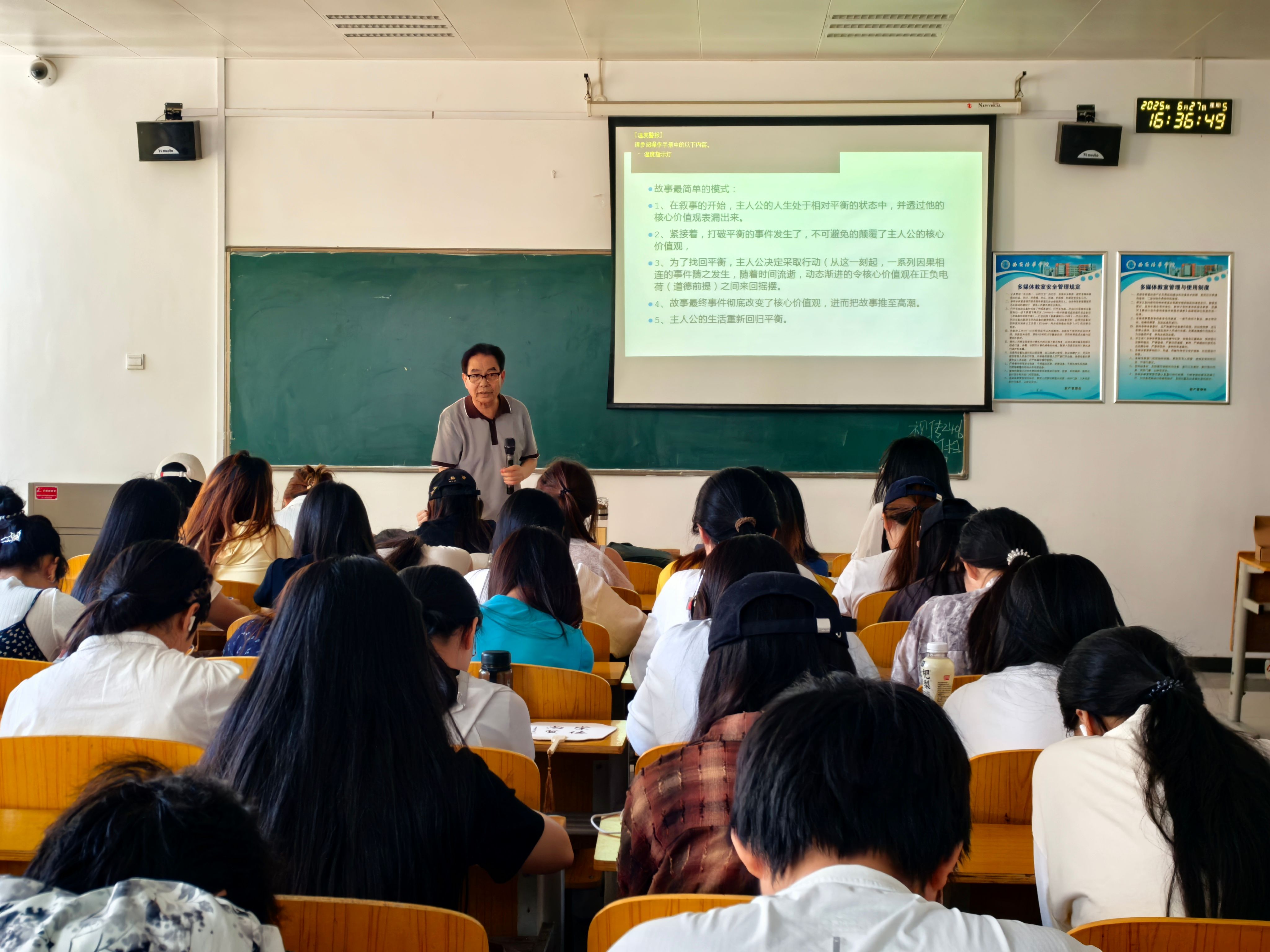 6月27日下午,传媒与设计学院广播电视编导专业与校企合作单位西咸新区作家协会联合举办的学术讲座在长安校区汇知楼6404教室成功举行。西咸新区作家协会主席王海、广播电视编导专业带头人陈玲教授、影视戏剧系副主任邱晓波、广播电视编导专业骨干教师朱艳等出席活动。本次讲座特邀行业专家崔城篪、田大放担任主讲人,围绕微短剧创作与故事艺术展开深入探讨,广播电视编导专业2024级全体学生到场聆听。