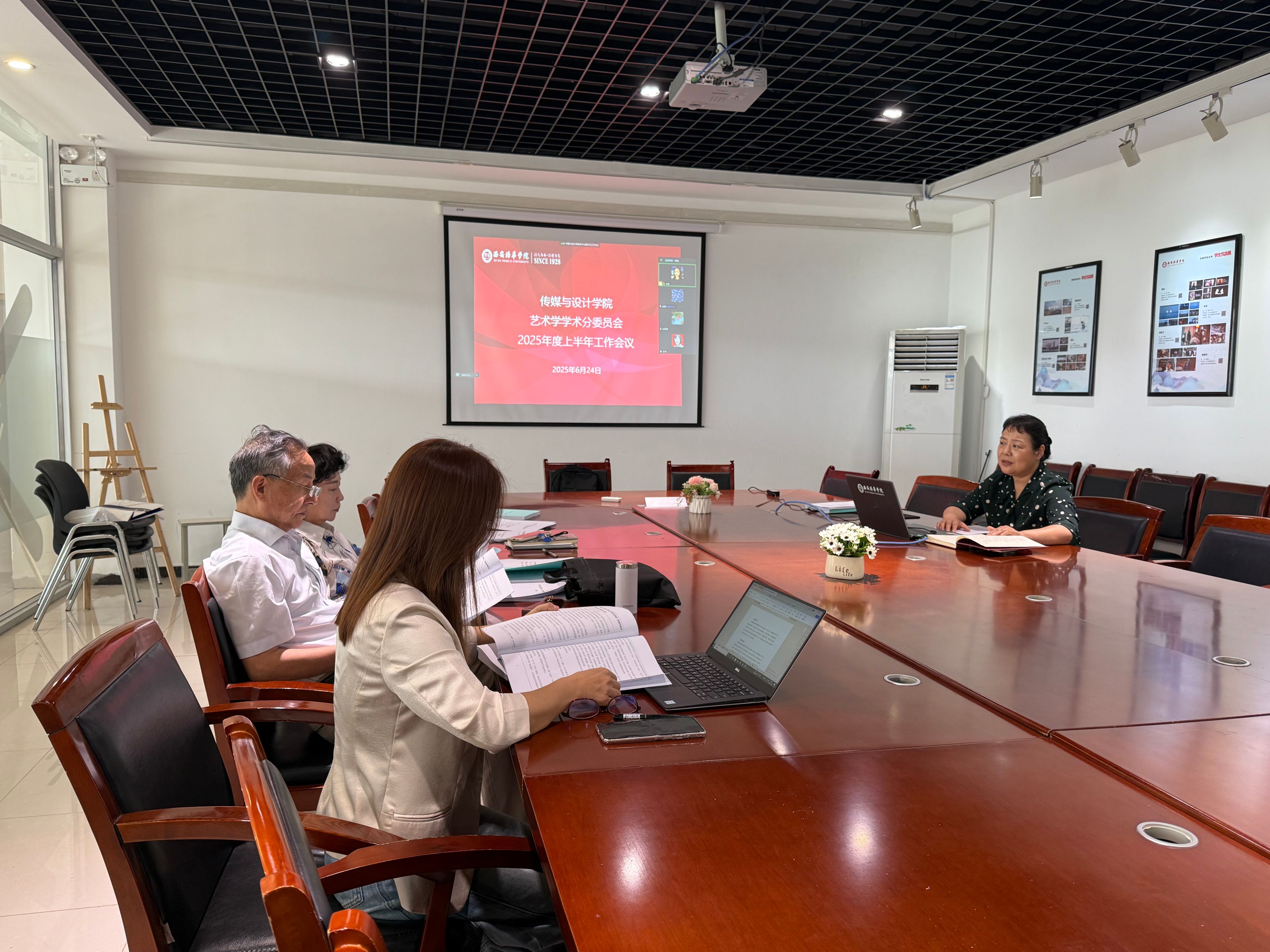 2025年6月24日中午,传媒与设计学院艺术学学术分委员会2025年度上半年工作会议在汇知楼第四会议室召开。会议由传媒与设计学院科研副院长邵璐主持,主席赵丽、副主席王萍及各位委员出席。本次会议特邀校级学术委员会委员徐青青教授莅临指导,围绕分委员会建设、学术任务部署及专著评审等议题展开深入研讨。