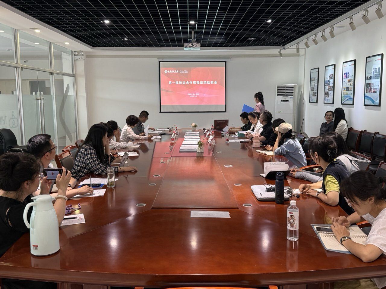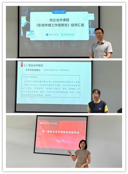 为进一步深化产教融合,推动教育创新,全面检验学院校企合作课程建设成果,5月19日下午,传媒与设计学院在第四会议室顺利开展了第一批校企合作课程结项验收工作。特别邀请了教师教学发展中心主任、应用型课程建设中心主任张伟,学院副院长、校级教学名师张荣花、学院副院长、数字媒体艺术专业带头人邵璐,督导组组长、新闻学专业负责人梁小凤、校级课程思政教学名师、播音与主持艺术专业骨干教师陈连龙担任专家评委,第一批校企合作课程负责人及团队成员现场汇报课程建设情况。本次结项验收工作吸引了2025年培育的校企合作课程及地方特色课程负责人现场观摩,为学院未来课程建设提供了宝贵的经验和示范。