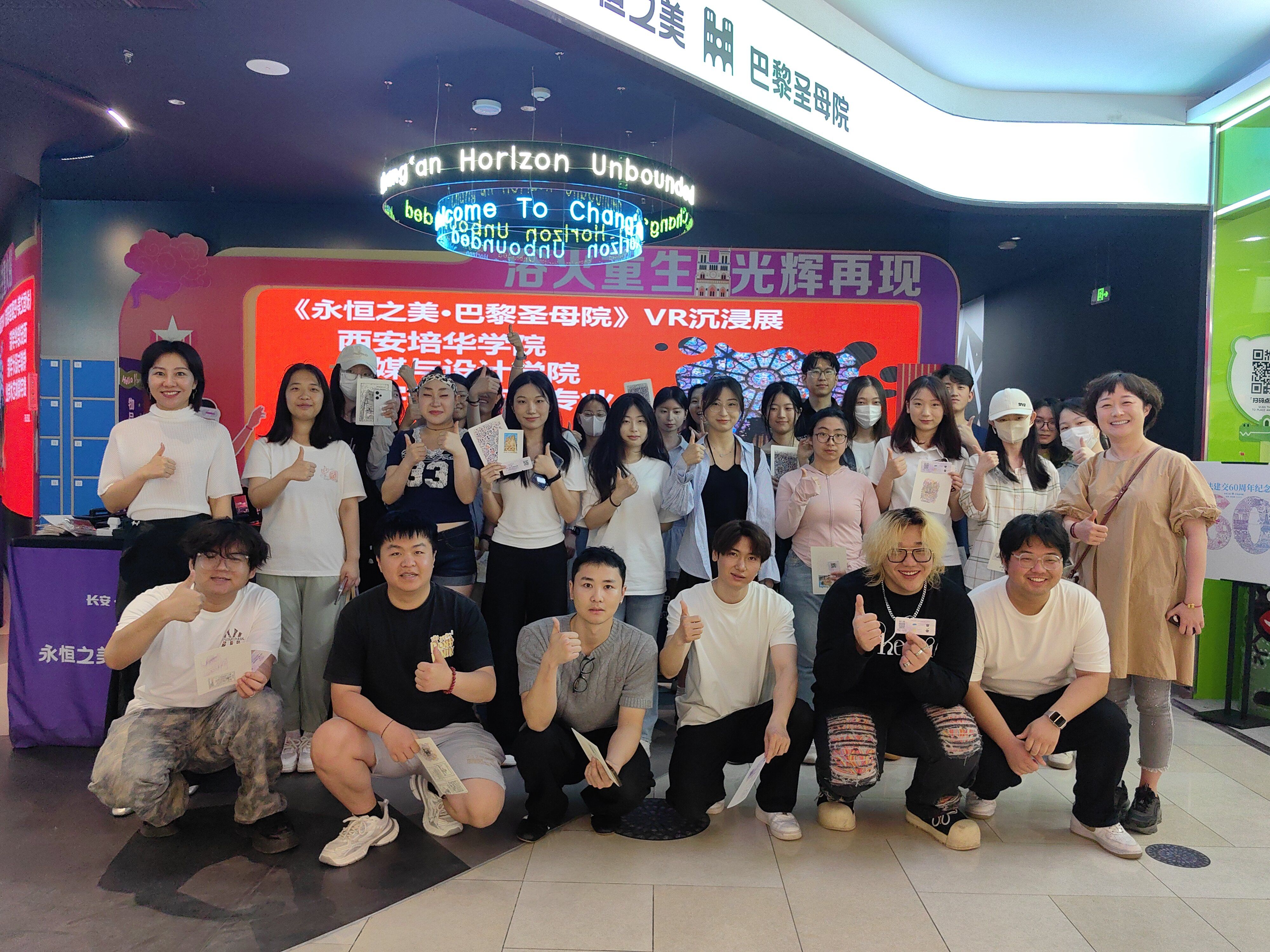 为切实落实理论与实践深度融合的教学理念,2025年5月12日上午,数字媒体艺术2024级(专升本)班的同学们,在《专业前沿调研》集中实践课程负责人贺迪老师的带领下,前往陕西省西安市曲江新区芙蓉新天地商场,参观了由陕文投主办的《永恒之美-巴黎圣母院沉浸式VR展》。