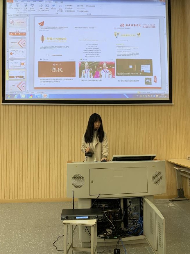 郝甜甜老师以《一篇公众号推文背后的故事》为题,从学院及班级公众号推送目的、文章类型以及微信公众平台审核规则讲起,希望大家首先从思想上重视新闻推送,以严谨认真的态度对待每一篇新闻。