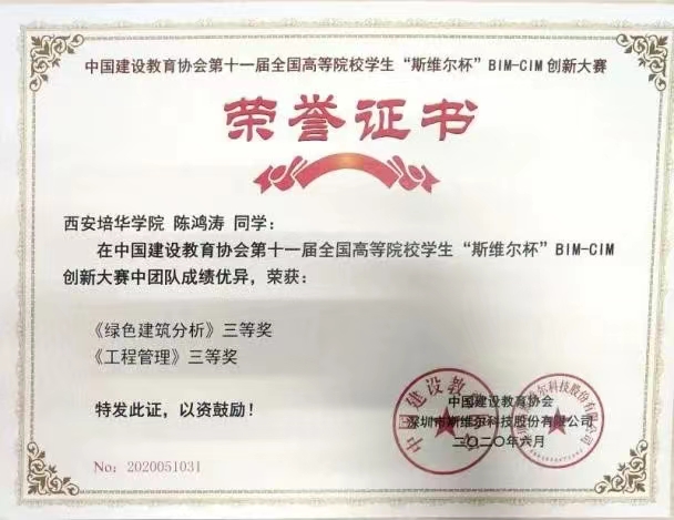 2020年11月,陕西省教科文卫体委员会主办的陕西省BIM大赛三等奖