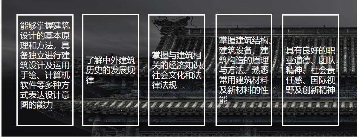 培养能够应对未来社会发展需要,具备建筑学学科基础理论知识和设计研究方法,具有扎实的设计能力和实践能力以及可持续发展和文化传承理念的德、智、体、美、劳全面发展的应用技术型高素质专门人才。