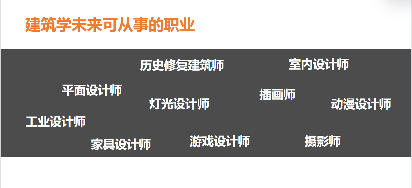 1. 进入建筑设计研究院和建筑设计事务所等,主要从事建筑设计、城市规划设计、风景园林规划设计、室内设计等工作