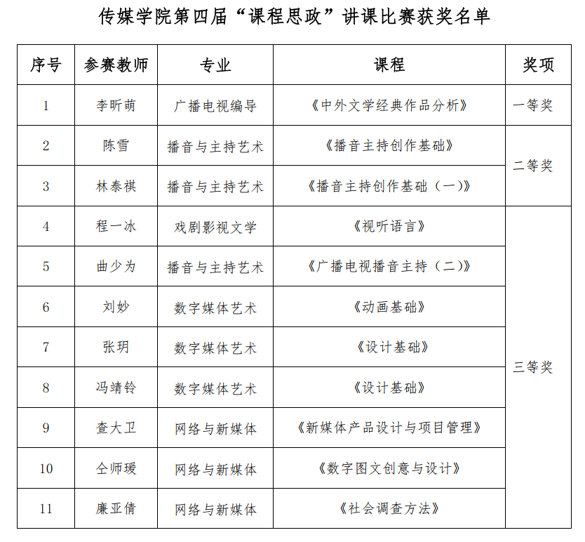 比赛结束后,三位评委对参赛教师进行了依次点评,对参赛教师的授课准备充分、整体教学设计合理、思政元素抓取准确等方面给予了充分的肯定,在教学设计、教学方法、教学效果、育人因素挖掘转化、教师素养等方面提出了建议和要求,教学过程要闭环,注重知识、能力、价值导向;教学设计要突出重点和难点,根据授课目的进行启发式教学;课程案例之间应注意寻找案例的连接点、共同点,能够做到自然融合;设计类课程可以突出中国传统文化的再现与复兴等。经过评委打分评审,最终评选出一等奖1名,二等奖2名,三等奖8名,传媒学院副院长张荣花及评委老师为获奖教师现场颁发获奖证书。