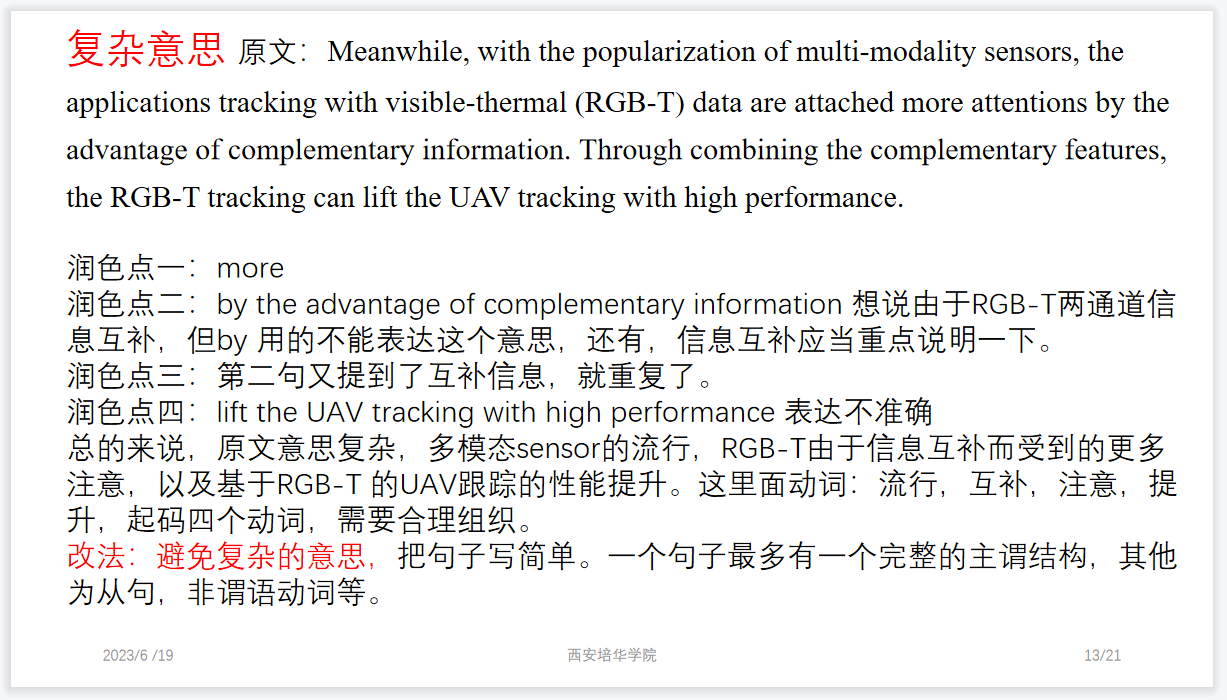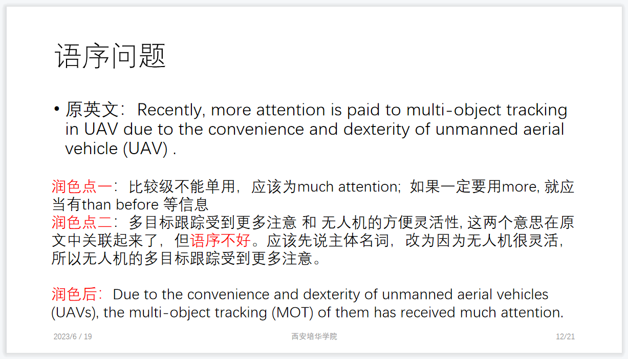 张九龙副教授从语言及内容两个方面切入剖析引文学术论文写作中的常见问题:语言方面的问题包括语言低级冗余、汉语组织能力不佳、语序前后不当等;内容方面的问题包括引言逻辑条理性不清晰,导入文章主要思想语句不醒目;相关工作组织结构不够完整;贡献点描述不充分,语言不够有说服力;摘要、结论、标题需改写等。
