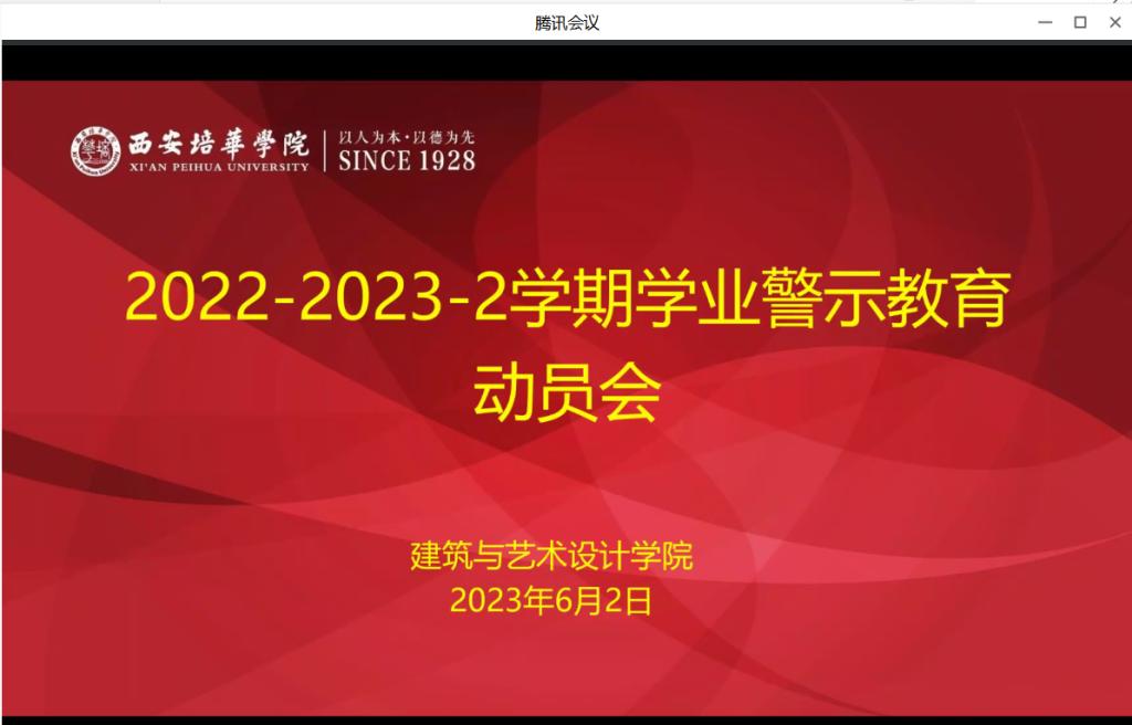 6月2日下午,建筑与艺术设计学院通过线上会议的形式召开了本学期学业警示教育动员会。会议由院长助理刘清颖主持。参会人员有:建筑与艺术设计学院常务副院长徐莹、党委书记兼行政副院长王飞、教学副院长王虎、辅导员、学业导师及全体被预警的学生。
