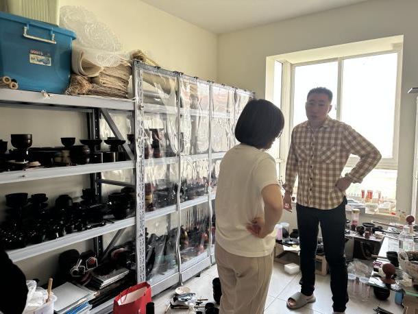 在参观张教授工作室时,张教授分享日用漆器创作经验,以木胎器碗为例,讲解了通过多次擦漆,既突出原木的肌理又耐高温,体现出大漆不可替代的性能优势,了解张教授寻找天然大漆的曲折故事。贾亚丽老师从专业建设、课程设置,同学们从漆的特性、材料以及创作过程中遇到的问题等方面同时与张志刚老师进行了深度交流。