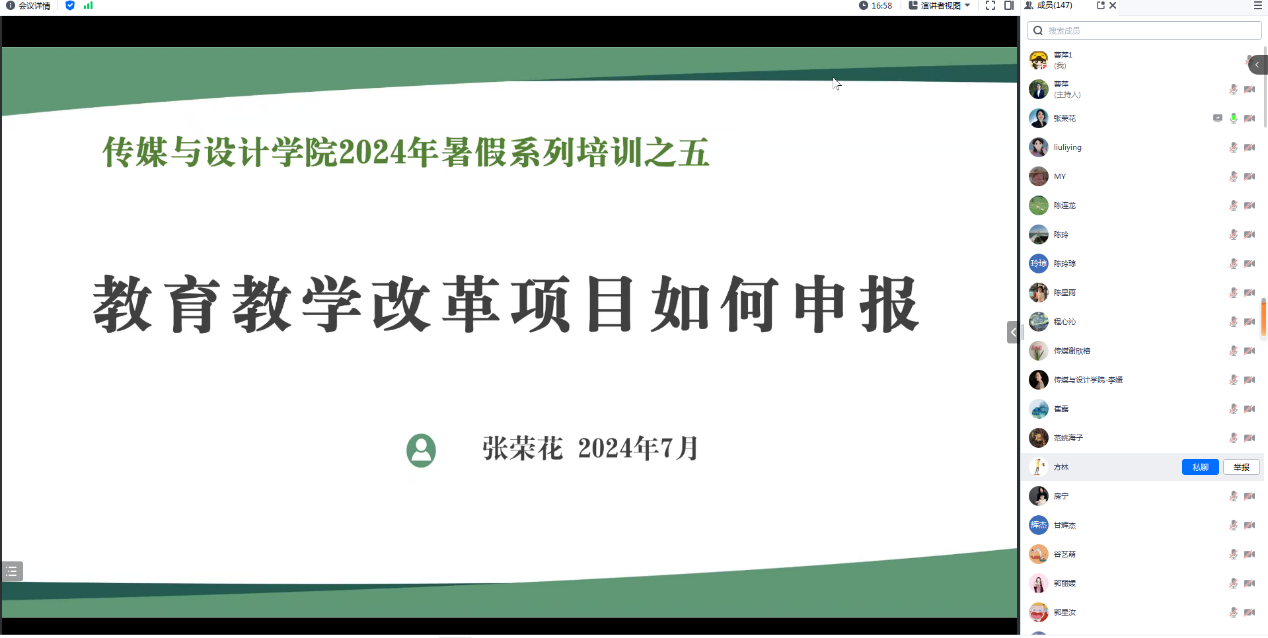 为进一步深化学院教育教学改革创新、提升教师教科研能力和水平,促进专业高质量发展,7月18日上午,传媒与设计学院通过腾讯会议举办了主题为如何申报教育教学改革项目专场讲座,该讲座是学院暑期业务培训第五场,由学院副院长张荣花担任主讲人,学院全体教师参加了本次讲座。