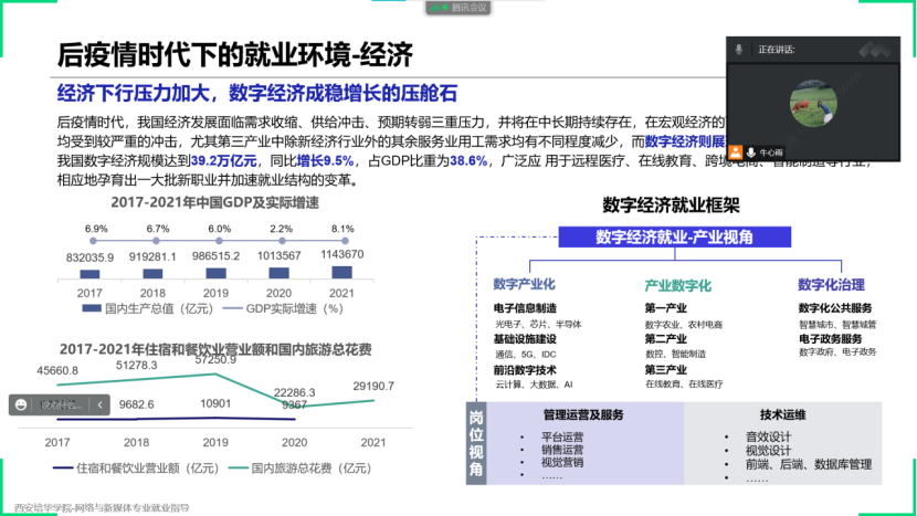首先,牛心雨老师通过大数据展示目前的就业形式,从经济、政策、人才供给、人才需求四个方面阐述了疫情背景下的就业变化。通过各类数据的横向对比,让学生了解到就业市场的侧重点变化,引出网络与新媒体专业在疫情下就业的突破口与机会点。