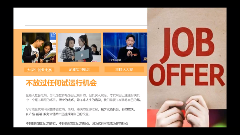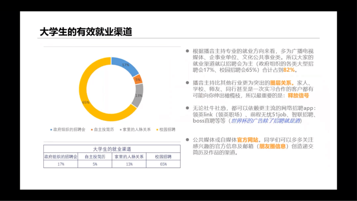讲座中,王璐老师就中国大学生当前的就业环境数据分析,开门见山的点出了当下大学生的就业形势问题。在简单介绍她自身的职业生涯经历和经验的基础上,分享了一些优秀职业人的就业、实习经历和心得来阐述榜样的力量。