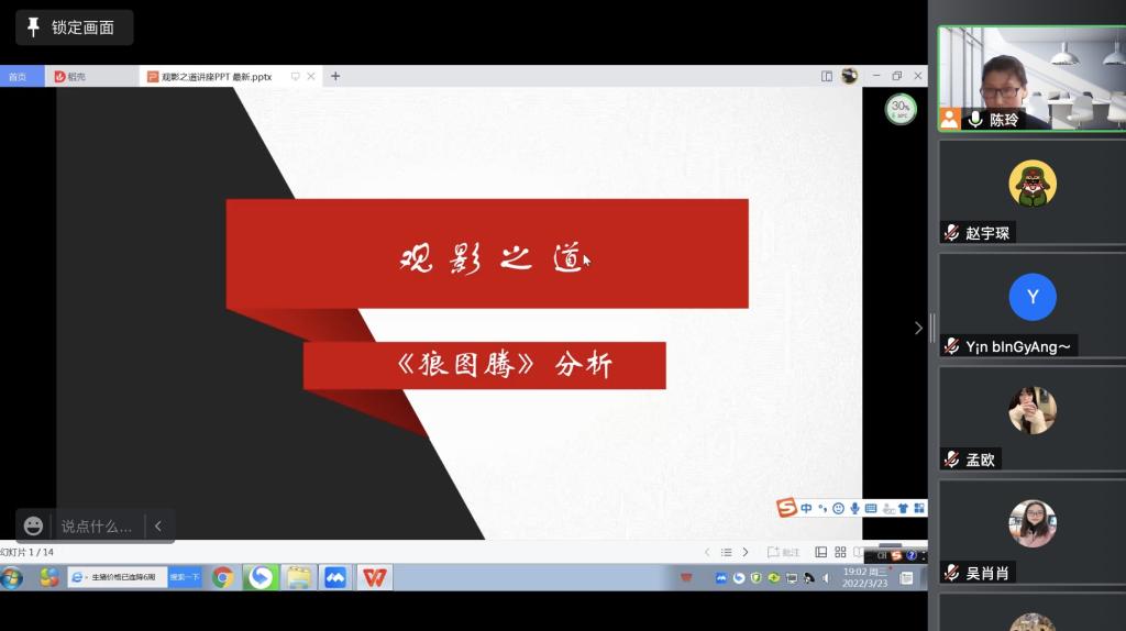 本次讲座旨在通过对于电影《狼图腾》的阐述,让学生了解导演如何营造场面,学会用不同的视角分析电影文本。讲座主要围绕三个主题展开:电影《狼图腾》的人物塑造,草原文化的精髓,影片《狼图腾》的思想主题。在讲述电影《狼图腾》的人物塑造时,陈玲老师从电影与人的思考角度,阐释了电影主人公性格特征的塑造问题,同时也为人物形象塑造提出了自己的思考。同时,陈玲老师从理论的高度对游牧文化展开解读,最终以图腾概念阐释草原狼与草原人的关系问题,由此展开对于本片思想主题的提炼与读解。