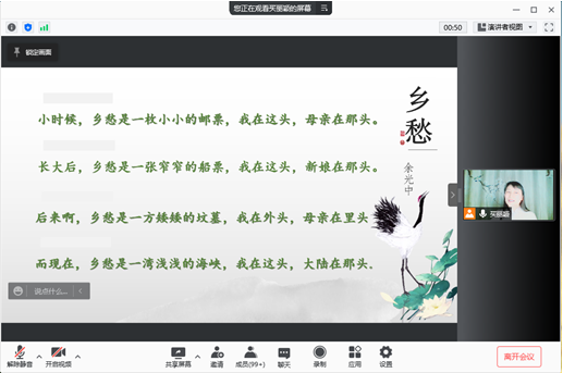 买丽颖老师表示,因疫情原因虽然无法面对面交流,但通过线上讲座和大家互动交流依然感到特别温暖和亲切。买老师由《简爱》《一休哥》《追捕》节选配音引入,通过重音、停连、节奏、语气四个部分,详细地为大家讲解了语言表达的外部技巧。买老师还朗诵了余光中先生的《乡愁》选段,亲自为同学们示范了如何正确运用不同的情感情语言来表达爱的感情、憎的感情、喜的感情、悲的感情等,并结合播音专业讲述了新艺术背景下语言艺术的传播特征和表达技巧。
