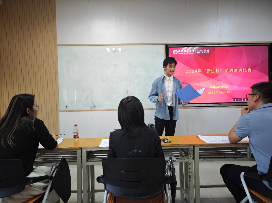 2024年10月16日下午,传媒与设计学院在6423教室隆重举行了2024年度“新生杯”英语演讲比赛。此次比赛旨在激发新生的英语学习热情,提升大学生的英语口语表达能力和逻辑思维能力,同时为同学们提供一个展示自我、挑战自我的平台。