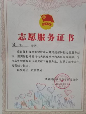 除此之外,我也会积极参加其他的志愿活动,比如去社区免费给老年人拍照,去参加消防演练等等。同时我获得了“共青团西安培华学院志愿服务证书”、“陕西省青年志愿者协会志愿服务证书”。