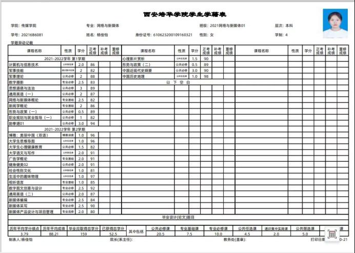 杨佳怡能够严格要求自己,凭着对个人目标和知识的强烈追求,刻苦钻研,勤奋好学,态度端正,目标明确,基本上牢固的堂握了一些专业知识和技能,同时把所学的理论知识应用干实践活动中,把所学知识转化为动手能力、应用能力和创造能力,力求理论和实践的统一。在学习和掌握本专业理论知识和应用技能的同时,还注意各方面知识的扩展,广泛的涉猎其他学科的知识,从而提高了自身的思想文化素质,并在学校资源提供下辅修第二专业。在不懈的努力下取得了良好的学习成绩,经过不断的努力在2022年荣获“优秀共青团干部”荣誉称号,2022年西安培华学院“关注女性健康”海报设计大赛中荣获励行奖。
