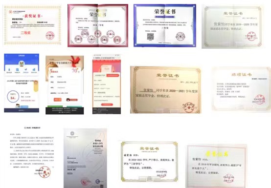 成绩优异:连续两年成绩均排名专业年级第一,平均学分绩点3.81,平均成绩87.95,连续两次获得国家励志奖学金,一次国家奖学金。获得西安培华学院“三好学生”、“优秀共青团员”、“军训先进个人”等奖项。