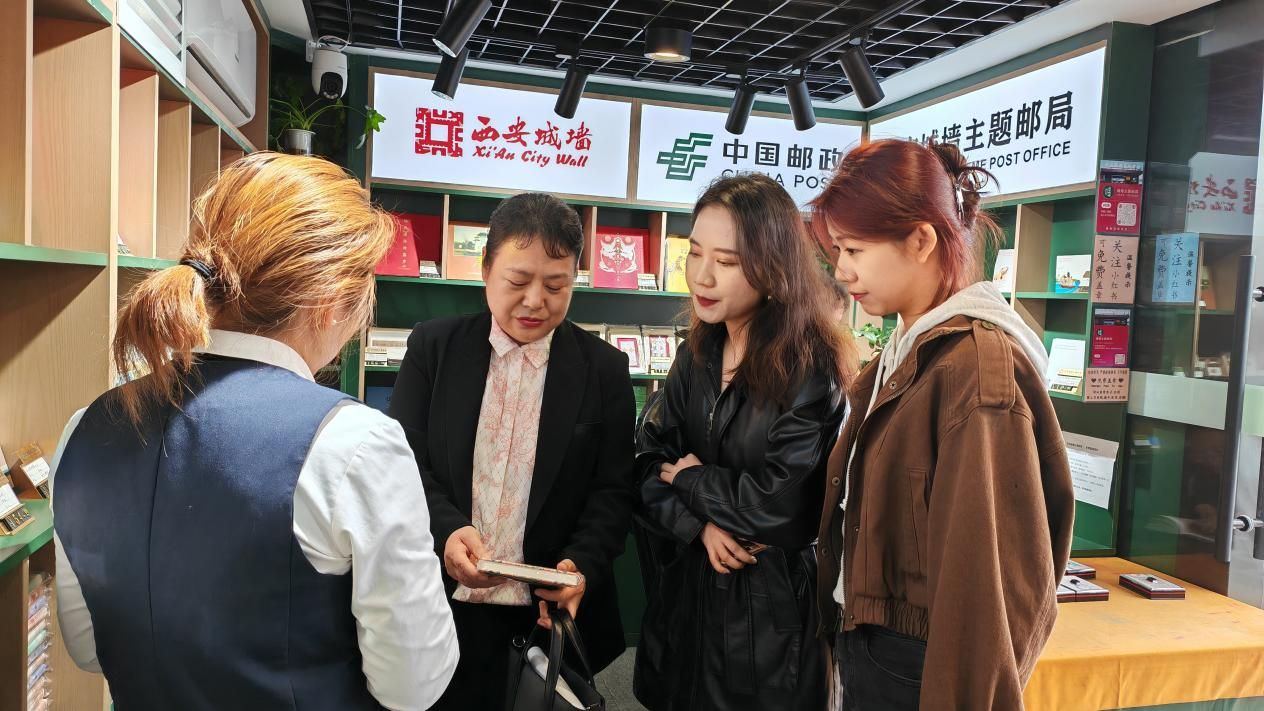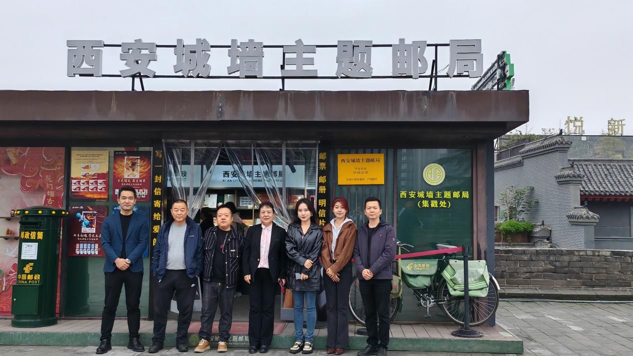 本次走访聚焦于文化创意产业的实践前沿。在西安天扬传媒有限公司负责人陈飞的陪同下,邵璐副院长一行首先来到了位于南门城墙景区的“西安城墙主题邮局”进行实地考察。该店是公司运营的标杆性文旅融合项目,店内陈列的各类融合了西安历史底蕴与现代设计美学的文创产品,如以城墙砖纹为灵感的文具、独具特色的明信片及文创纪念品等,给走访团队留下了深刻印象。邵璐副院长与团队成员详细了解了产品的设计理念、市场定位及运营模式,对天扬传媒在挖掘本地文化IP、推动文旅商业创新方面取得的成果给予了高度评价。
