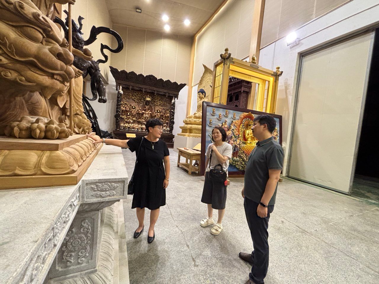 参观琢一工艺品有限公司7月23日,福州琢一工艺品有限公司董事长、脱胎漆器髹饰技艺代表性传承人、正高级工艺美术师陈国勇带领学院常务副院长徐莹一行参观了脱胎漆器造像、夹纻佛像、木雕、敦煌仿古造像等非遗技艺的产品展厅。陈国勇以“守正创新”为主题,详细介绍了公司的业务范围、产品工艺及人才需求。琢一工艺品有限公司作为福建省工艺美术行业的标杆企业,长期致力于传统工艺与现代技术的融合创新,其产品在国内外市场享有较高声誉。