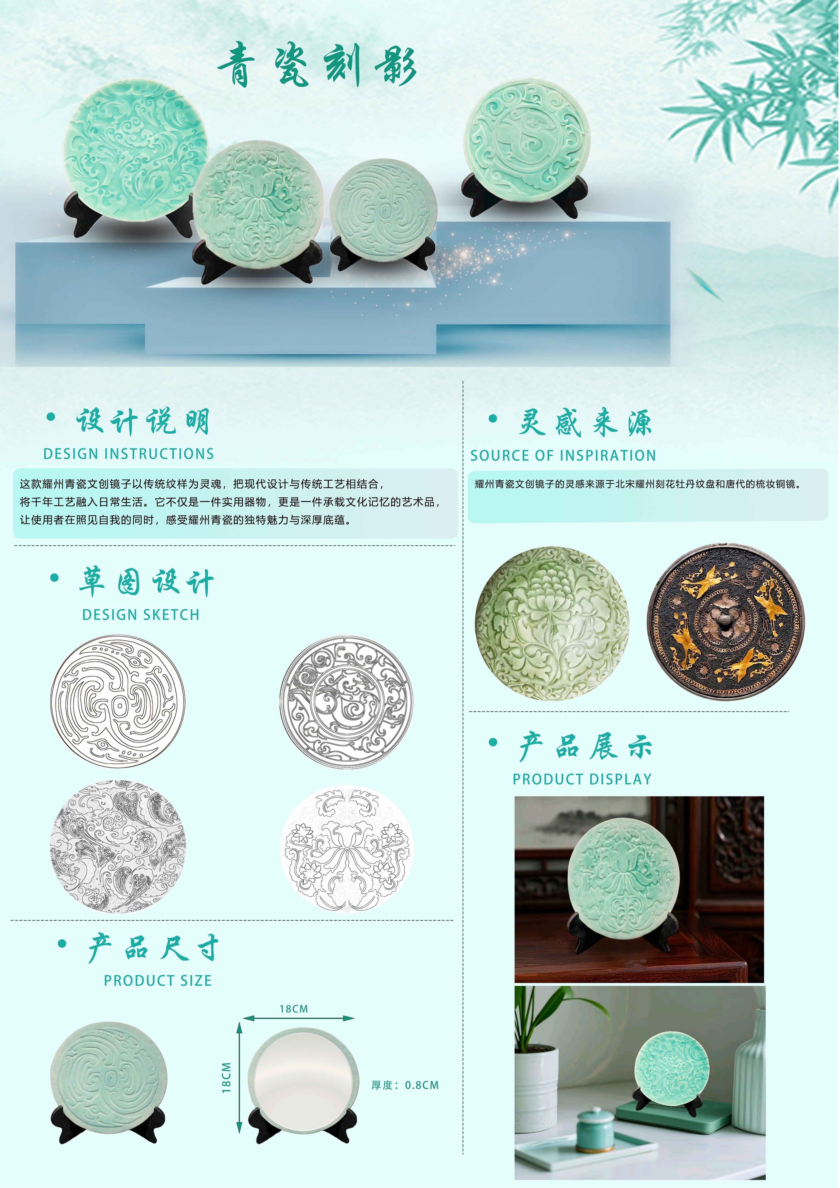 其中,学生贾茉钰的《青瓷刻影》以中国古代铜镜为造型原型,选取其“映物观己”的文化意涵作为创作切入点,结合耀州窑传统刻花技艺,通过青瓷材质演绎历史与现实、功能与象征的融合表达。作品造型借鉴铜镜的圆形规整、细部棱纹与镜钮构成,寓意“圆满、内省、对照”。表面纹饰采用刀刻表现技法,图案参考宋代铜镜上常见的瑞兽、博古与花卉纹,融入现代几何构形进行重组,形成虚实交错、内敛含蓄的视觉层次。作品既是一次对宋代耀州窑刻花青瓷语言的当代表达,也是一种借“镜”思人的文化象征,体现出传统与现代之间的对话与重构。