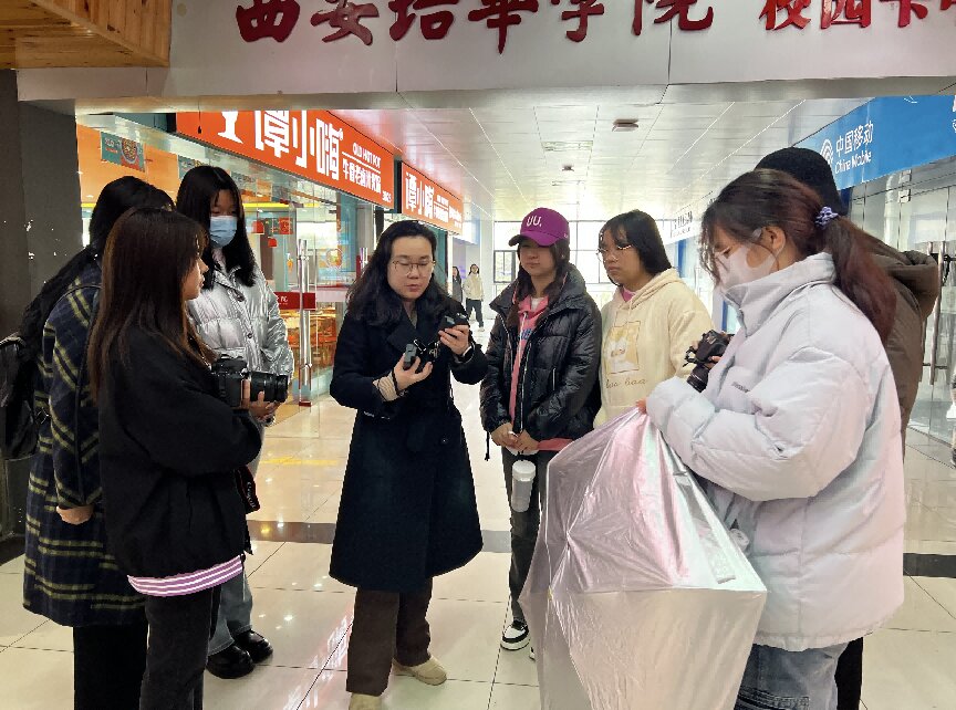 课程学生参与校园饮食安全新闻报道项目拍摄现场;王雨晴老师带领学生进行实地拍摄实践指导。该项目组课程紧密结合当下新闻传播热点,引入数字AI新闻摄影技术等前沿内容,开展项目式教学、团队协作和实战训练。学生以小组为单位参与企业真实项目,如中国食品安全报社(陕西记者站)的校园饮食安全新闻报道项目、西安木有牛丸网络科技有限公司的数字AI新闻摄影技术应用项目等。