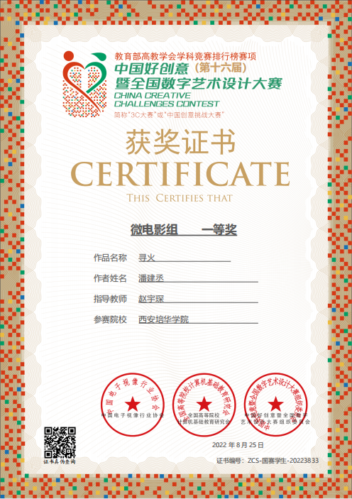 中国好创意暨全国数字艺术设计大赛由中国电子视像行业协会主办,旨在落实国家数字创意产业远景规划,转化高等院校原创知识产权,深度挖掘、选拔和推广中国创意界的精英人才和优秀作品的高级别赛事。这是我院第一次以学院为单位选拔报送优秀作品参与大赛角逐。在报送的71组优秀学生作品中,传媒学院广播电视编导专业赵宇琛老师指导2018级学生潘建丞的作品《寻火》荣获微电影组国家级一等奖,戏剧影视文学专业教师房宁老师指导2020级学生梁陆钧、许愿、谢文浩的作品《长安·常安》荣获视觉传达组国家级三等奖,广播电视编导专业范瑞婵老师指导2020级学生王琳的作品《老陕的味道》荣获微电影组省级三等奖。数字媒体艺术专业冯靖铃老师创作的作品《新仓颉在洛南造二十八字》荣获教师单元视觉传达组国家级二等奖。