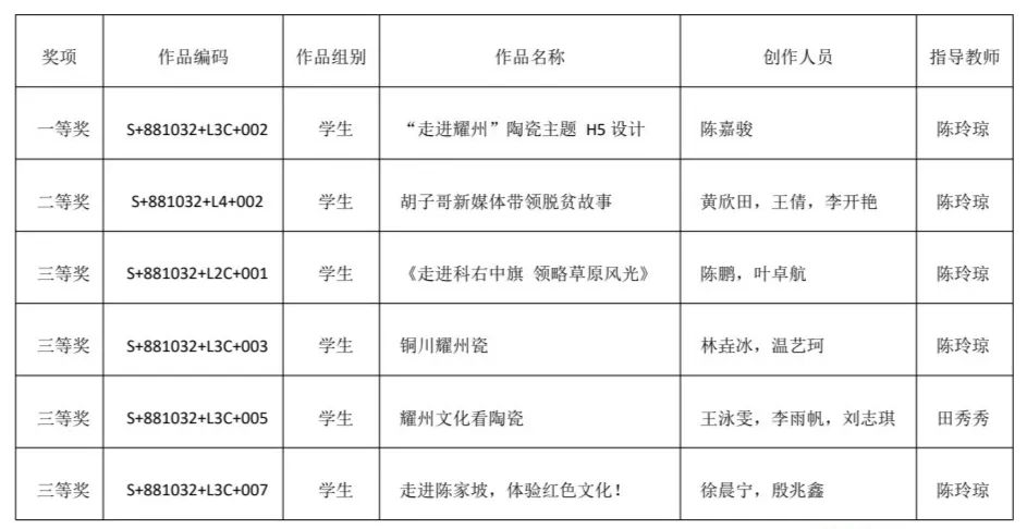 近日,第八届全国高校数字艺术设计大赛(NCDA大赛)省/区级评选结果揭晓,传媒学院新闻传播系陈玲琼老师和田秀秀老师指导学生获得西北赛区一等奖1项,二等奖1项,三等奖4项。