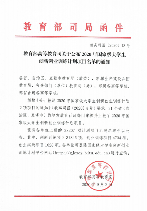 9月2日教育部高教司公布了2020年大学生创新创业训练计划项目国家级立项名单其中我院戏剧影视文学专业聂婷和广播电视编导专业郭丽媛两位老师指导的大学生创新创业训练计划项目获得国家级立项。