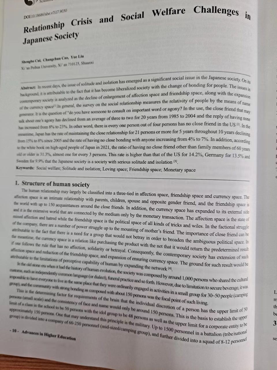 Abstract: In recent days, the issue of solitude and isolation has emerged as a significant social issue in the Japanese society. On its background, it is attributable to the fact that it has become liberalized society with the change of bonding for people. The issues in contemporary society is analyzed as the decline of enlargement of affection space and friendship space, along with the expansion of the currency space.In general, the survey on the social relationship measures the relativity of people by the means of name generator. It is the question of “do you have someone to consult on important word or agony? In the use, the close friend that may talk about one’s agony has declined from an average of three to two for 20 years from 1985 to 2004 and the reply of having none has increased from 8% to 23%. In other word, there is every one person out of four persons has no close friend in the US . In the meantime, Japan has the rate of maintaining the close relationship for 21 persons or more for 5 years throughout 10 years declining from 15% to 8% since 2005 and the rate of having no close bonding with anyone increasing from 4% to 7%. In addition, according to the white book on high-aged people of Japan in 2021, the ratio of having no close friend other than family members of 60 years old or older is 31.3%, almost one for every 3 persons. This rate is higher than that of the US for 14.2%, Germany for 13.5% and Sweden for 9.9% that the Japanese society is a society with serious solitude and isolation .