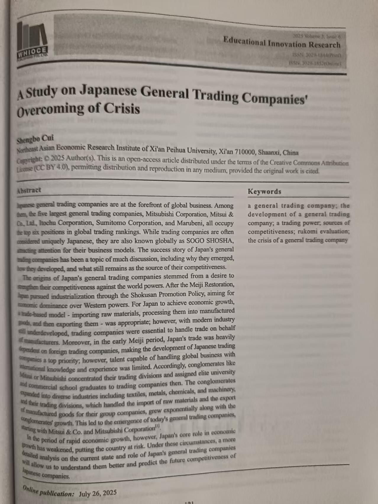 Abstract: Japanese general trading companies are at the forefront of global business. Among them, the five largest general trading companies, Mitsubishi Corporation, Mitsui & Co., Ltd., Itochu Corporation, Sumitomo Corporation, and Marubeni, all occupy the top six positions in global trading rankings. While trading companies are often considered uniquely Japanese, they are also known globally as 「SOGO SHOSHA」, attracting attention for their business models. The success story of Japan’s general trading companies has been a topic of much discussion including why they emerged, how they developed, and what still remains as the source of their competitiveness.