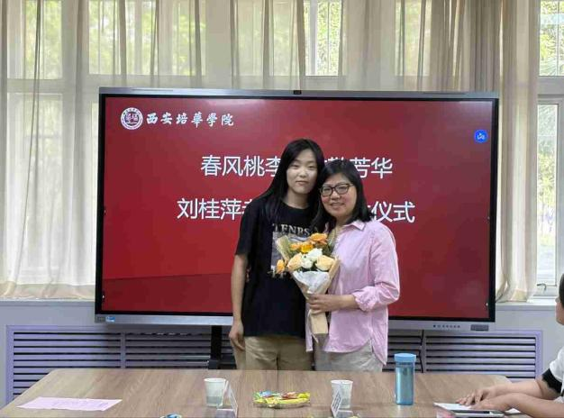 学生代表李蓉怀着崇敬之情向刘桂萍老师献上鲜花。
