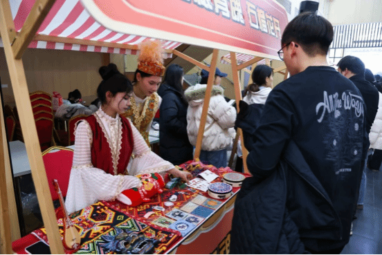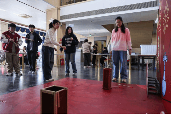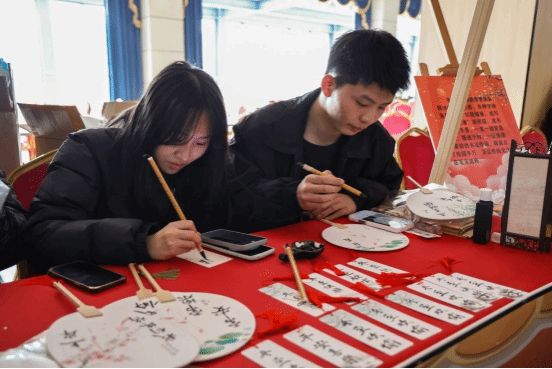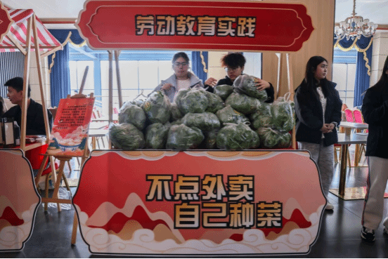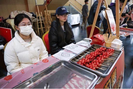 活动现场暖意融融,师生围坐一桌,面粉飞扬间传递着长辈对晚辈的殷切关怀。活动创新融合传统与创意,设置多个特色集市区域:书法集市中墨香四溢,同学们挥毫写下寓意吉祥的对联;投壶、套圈等趣味游戏让节日快乐翻倍;糖葫芦制作、咖啡体验区则充满烟火气;劳动教育成果集市里,同学们现场分发亲手种植的青菜;民族体验区更让师生近距离感受少数民族传统文化魅力。