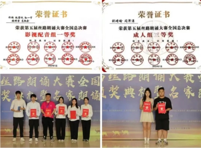 Broadcasting and Hosting Arts students Xu Shuo, Zhao Peiyi, Sun Yining, Zhang Ziying, and Gao Kaihan won the first prize in the film and television dubbing category, and Broa-dcasting and Hosting Arts majors Liu Jingyu and Yan Zetao won the third prize in the National Competition Adult Recitation Category.