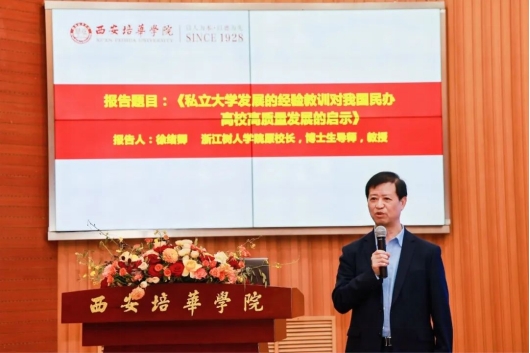 Professor Xu Xuqing, former president of Zhejiang Shuren University, gave a report titled “Lessons and Experiences from the Development of Private Universities and Their Enlightenment for the High Quality Development of Private Universities in China”