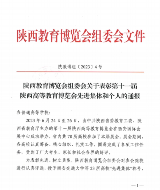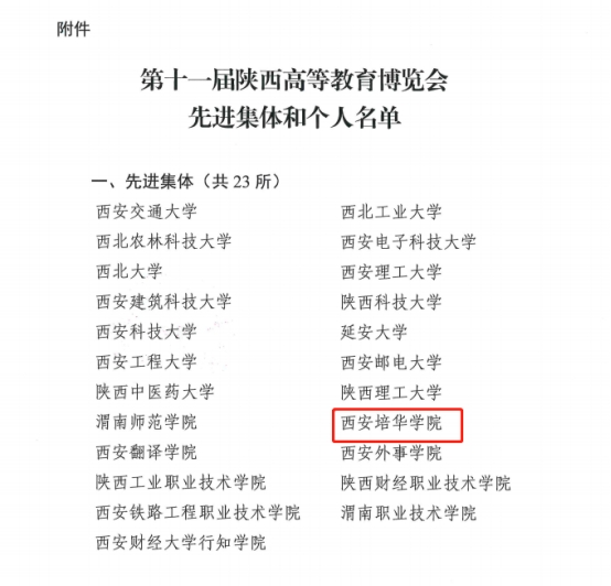 Recently, Shaanxi Education ExpositionOrganizing Committee issued the“Notice on Commending AdvancedCollectives and Individuals of the 11thShaanxi Higher Education Expo”. After careful selection,the Committee made the decisionto award 23colleges anduniversities the title of“Advanced Collective”,withXi’an Peihua Universityon the list.